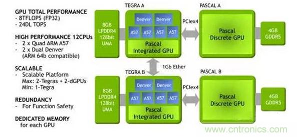 NVIDIA推出的Drive PX2被黃仁勛稱為“為汽車設計的超級電腦”,它將成為汽車的標準配備,可以用來感知汽車所處位置、辨識汽車周遭的物體,并且即時計算最安全的路徑。“Tegra X1處理器和10GB內存,能夠同時處理12個200萬像素攝像頭每秒60幀的拍攝圖像,并通過環境視覺計算技術和強大的深層神經網絡,主動識別道路上的各種車輛,甚至還能檢測前方車輛是否在開門。Driver PX2還搭載了其他合作伙伴的芯片,包括Avago的PEX8724(24-lane,6-port,第三代 PCIe Gen交換機)用于兩塊Parker之間的互聯。還有一片英特爾收購的Altera提供的FPGA,用于執行實時操作系統。FPGA的型號為Cyclone V 5SCXC6,是Altera的頂級產品,邏輯運算為110K,注冊器達166036。最后還有一款英飛凌的AURIX TC 297 MCU做安全控制,據說可以讓PX2達到ASIL C級水平。 還有博通的BCM89811低功耗物理層收發器(PHY),使用BroadR-Reach車載以太網技術,在單對非屏蔽雙絞線上的傳輸速率可達100Mbps。所以NVidia實際上推出了板級的ADAS系統。
