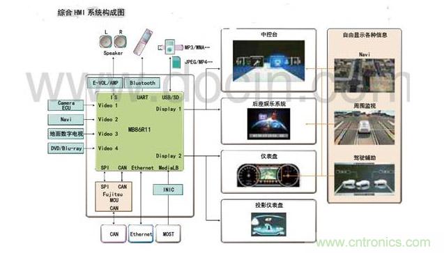富士通的ADAS技術主要涉及透過攝像頭和傳感器的結合,實現圖像識別輔助和接近目標檢測,應用的領域主要有360度3D立體全景輔助、可視停車輔助、駕駛盲區監控、安全開車門以及車行駛方向周圍的障礙物和行人的識別。包括基于MB86R11“Emerald-L”2D/3D圖像SoC的全景視頻系統支持前后左右四個攝像頭進行汽車周邊環境的實時全景視頻監測。從公開資料顯示,富士通似乎更熱衷于虛擬儀表盤及車載信息娛樂系統的構建,但這一塊是最容易被國內芯片公司模仿并超越的。