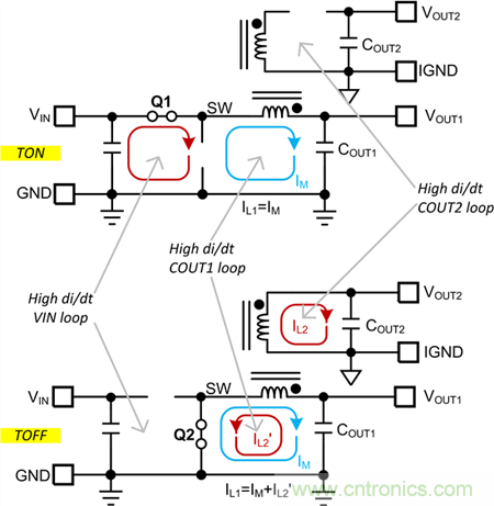 Fly-Buck 轉換器的一次側看上去與降壓轉換器類似,如圖 2 所示。這里的 VIN 環路與降壓轉換器一樣,也是高 di/dt 環路。然而,VOUT1 環路的電流與降壓轉換器有很大不同。除了一次電感器磁化電流外,該環路還包含來自二次繞組的反射電流。反射電流只含有其路徑中耦合電感器的漏電感,因此 di/dt 明顯高于電感器磁化電流。所以盡量減小 VOUT1 環路的環路面積也非常重要。同樣的道理,包含二次電感器繞組、整流器二極管以及二次輸出電容器的二次輸出環路也需要最小化,因為里面有高 di/dt 電流流過。