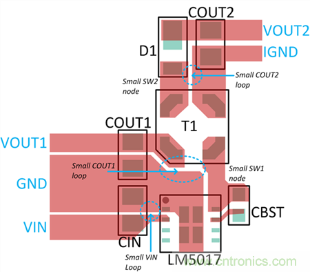 圖 3.基于 LM5017 的 Fly-Buck 布局可對 di/dt 環路和高 di/dt SW1,2 節點面積進行最小化。