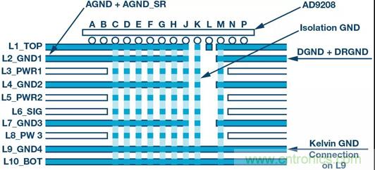 通過充分濾波和布局分離,各個域可以合理布置,使得ADC性能最大化,同時降低BOM和PDN復雜性。各接地域采用開爾文連接方法也會改善隔離。從網表角度來看,仍然只有一個GND網。電路板可以劃分為不同接地域以提供充分的隔離。在AD9208的評估板AD9208-3000EBZ中,不同接地分區在第9層上形成開爾文連接。圖4所示為10層PCB(印刷電路板)AD9208-3000EBZ的橫截面,其顯示了不同GND連接。