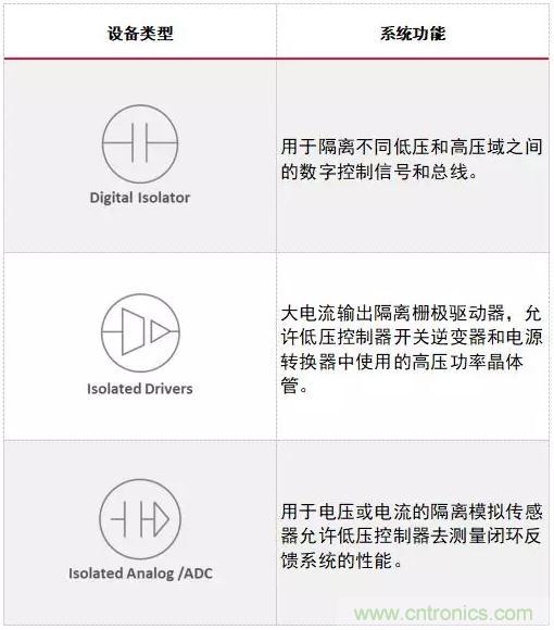 表1:電動車輛系統中使用的隔離元器件