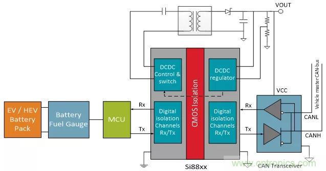 在圖3中,高壓域是電池組一側,低壓域是CAN收發器一側。此示例主要關注CAN總線接口,但微控制器(MCU)和電池組本身之間可能有額外的隔離。