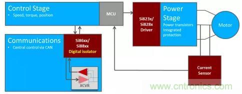 這些系統需要在馬達控制器和功率晶體管之間采用隔離驅動器。隔離允許低壓控制器安全地開關高功率晶體管以產生交流波形。此外,馬達控制系統中可能存在隔離的CAN總線,并且有某些方法可以感測驅動馬達的電流,以監控速度和轉矩。圖4展示了一個使用一系列數字隔離設備的簡化的牽引馬達控制系統。