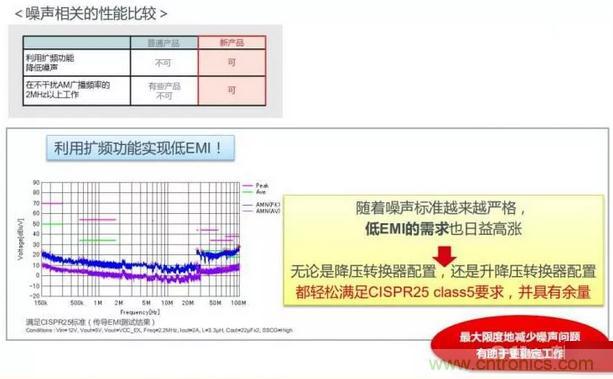 而且,同時實現車載ECU電源所需的“低電磁干擾性能”和“高電壓輸入、低電壓輸出,不干擾AM廣播頻段”,有助于對噪聲性能要求高的車載系統穩定工作。