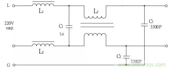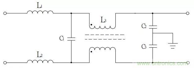 圖中L1、L2、C1構成常模濾波器,L3、C2、C3構成共模濾波器。