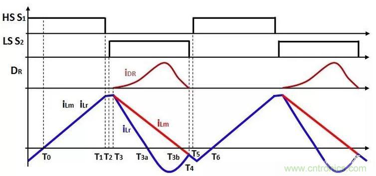 變壓器Lm和Lr的電流從0開始增加,諧振電容Cr充電,沒有能量傳輸到次級的輸出負載。