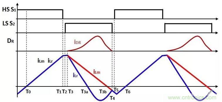 次級繞組的電流減小到0,DR關斷,ZCS關斷,同時,在T4時刻,S2關斷。