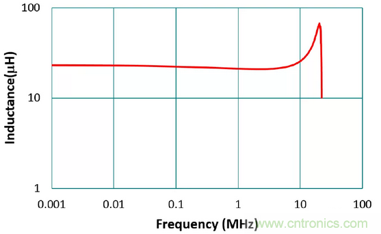 電感器之電感值在電路設計時為最重要的基本參數,但必須看在工作頻率下此電感值是否穩定。電感的標稱值通常是在沒有外加直流偏置的條件下,以100 kHz 或1 MHz 所量得。且為確保大量自動化生產的可能性,電感之容差值(tolerance)通常是 ±20%(M)與±30%(N)居多。圖3為利用表量測 電感220M 之電感-頻率特性圖,如圖所示,在5 MHz 之前電感值的曲線較為平坦,電感值幾乎可視為常數。在高頻段因寄生電容與電感所產生的諧振,電感值會上升,此諧振頻率稱為自我諧振頻率,通常需遠高于工作頻率。