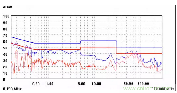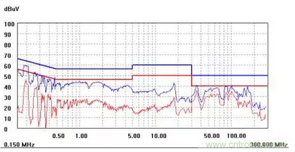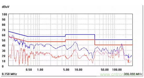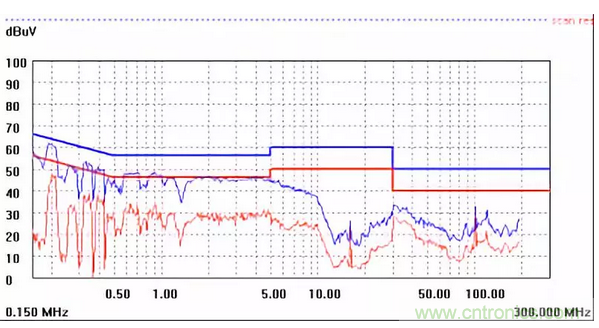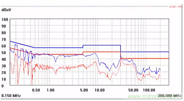圖一a可以看出,改變PCB布局后130M-200M已經完全被衰減,但是30-130M沒有圖一效果好,可能變壓器出線無交叉好一些。仔細觀察,此IC具有抖頻功能,傳導部分頻段削掉了一些尖峰;