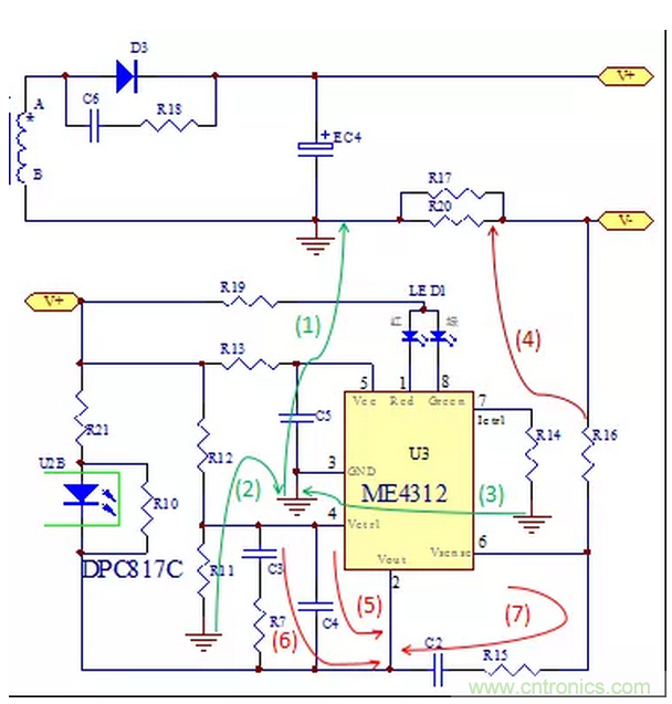 如(1)(2)(3)綠線所示,R11的地和R14的地連接到芯片的地,再連接到EC4電解電容的地。注意不可連到變壓器的地,因為變壓器次級A->D3->EC4->次級B形成功率環,如果ME4312芯片的地接到次級B線到EC4電容之間,受到較強的di/dt干擾會導致系統的不穩定等因素。