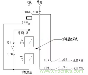 上圖中,6#與10#、7#與11#、8#與12#是繼電器常開觸點,13#與14#繼電器線圈觸點,A和B分別是雙浮球的上下限位開關。該電路只有當水位下降至最低限位之后才會工作。