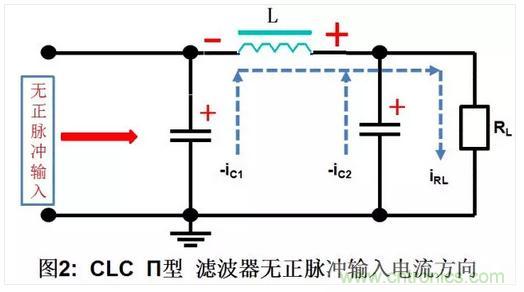 b. 輸入正脈沖消失,負載RL的電流由兩路提供,一路是C2放電提供的電流為-ic2,,另一路是由電感L儲存的磁能轉換成電能,并與C1上的電壓串聯后提供-ic1。負載RL中的電流等于兩個電容器放電電流的和,即IL= -(ic2+ic1)