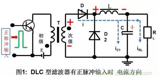 a.輸入正脈沖時,先給C1充電,充電電流為ic1,迅速充到脈沖的峰值電壓Vi,同時電感器L中也有線性增長的電流,并在L中儲存了磁能,隨著電流的增長,儲存的磁能越來越多,電容器C2通過電感L也充上了電壓,充電電流為ic2,C2和C1上的電壓基本相等,負載RL中的電流IRL也是由輸入脈沖供給。