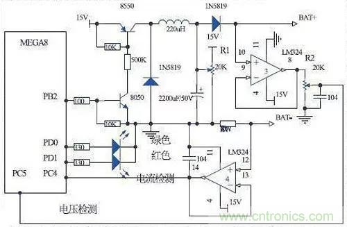 本系統主要有微控制器、電壓檢測電路、電流檢測電路、電池狀態指示電路和充電控制電路組成,電路原理圖如圖所示。