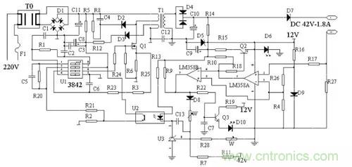 LM358(雙運算放大器,1腳為電源地,8腳為電源正)及其外圍電路提供12V工作電源D9為LM358提供基準電壓,經R26,R4分壓達到LM358的第二腳和第5腳正常充電時,R27上端有0.15-0.18V左右電壓,此電壓經R17加到LM358第三腳,從1腳送出高電壓當電池電壓上升到44.2V左右時,充電器進入恒壓充電階段,輸出電壓維持在44.2V左右,充電器進入恒壓充電階段,電流逐漸減小當充電電流減小到200mA-300mA時,R27上端的電壓下降,LM358的3腳電壓低于2腳,1腳輸出低電壓,Q2關斷,D6熄滅同時7腳輸出高電壓,此電壓一路使Q3導通,D10點亮另一路經D8,W1到達反饋電路,使電壓降低充電器進入涓流充電階段1-2小時后充電結束。