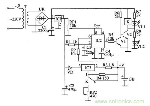 電源電路由電源開關S、電源變壓器T、整流橋堆UR、濾波電容C1、C2和三端集成穩壓集成電路IC1組成;充電電路由二極管VD、三端可調穩壓集成電路IC3、電阻R2~R4、電位器RP2和繼電器K的控制觸頭等組成;控制電路由時基集成電路IC2、電位器RP1、電阻R1、R5~R8、電容C3、C4、晶體管V1、V2、繼電器K和發光二極管VL1、VL2組成。