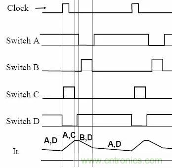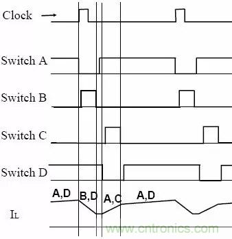 當輸入電壓比輸出電壓低△V,即輸入電壓略高于輸出電壓時,系統工作于降壓式BuckBoos模式。開關周期起始時,開關管B/D先同時導通,然后A/C同時導通,最后是A/D同時導通,即開關管導通的順序為:B/D–A/C–A/D。