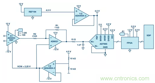 圖1中的電路顯示了帶有2.5MSPS和上游可編程儀表放大器的16位SAR轉(zhuǎn)換器,它將增益設(shè)置為1或100。通過在FPGA中進(jìn)行過采樣和數(shù)字信號(hào)處理,該電路可實(shí)現(xiàn)大于125dB的動(dòng)態(tài)范圍,并且仍然非常安靜。高動(dòng)態(tài)范圍是通過AD8253的自動(dòng)切換和過采樣實(shí)現(xiàn)的,其中信號(hào)的采樣速率遠(yuǎn)高于奈奎斯特頻率。