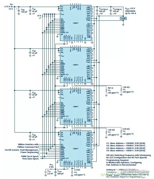 圖7:利用四個LTM4677模塊并聯的應用電路圖,可提供高達144A的電流