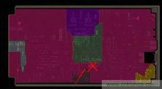 做電源分割時應盡量避免相鄰信號線跨分割情況,信號在跨分割(如下圖示紅色信號線有跨分割現象)處因參考平面不連續會有阻抗突變情況產生,會產生EMI、串擾問題,在做高速設計時,跨分割會對信號質量影響很大。