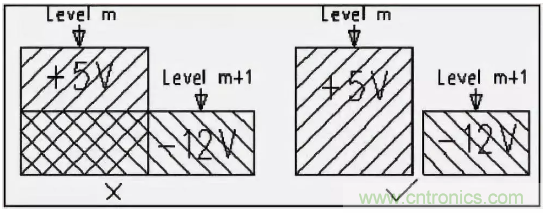 如若在相鄰平面處理電源,要盡量避免銅皮或者走線平行處理。主要是為了減少不同電源之間的干擾,特別是一些電壓相差很大的電源之間,電源平面的重疊問題一定要設法避免,難以避免時可考慮中間隔地層。