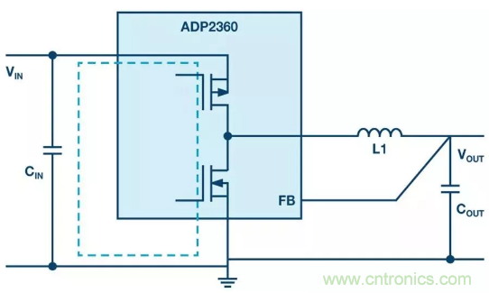 圖1:用于降壓轉換的開關穩壓器(帶如虛線所示的關鍵熱回路)。