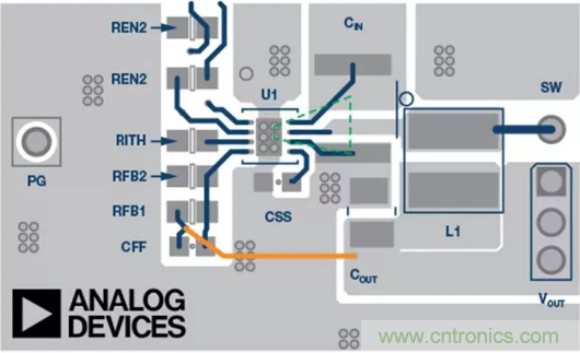 不得在電感下方(PCB表面或下方都不行)、在內層里或PCB背面布設敏感的控制走線。受電流流動的影響,線圈會產生磁場,結果會影響信號路徑中的微弱信號。在開關穩壓器中,一個關鍵信號路徑是反饋路徑,其將輸出電壓連接到開關穩壓器IC或電阻分壓器。