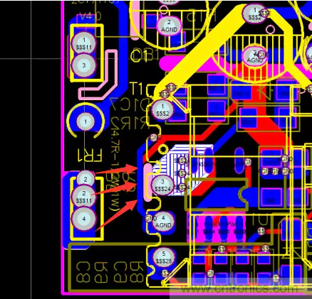 47.PCB的熱點區域一定要遠離輸入、輸出端子,防止噪聲源串到線上導致EMI變差,在不得已而為之時,可增加地線或其它屏蔽方式進行隔離,如下圖增加了一條地線進行有效隔離。