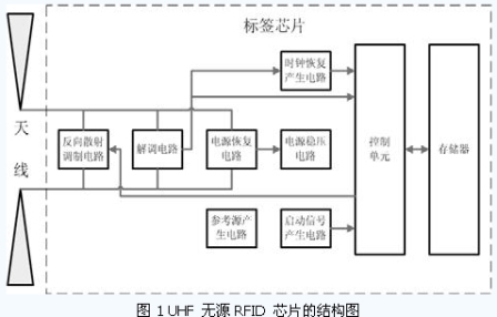 如圖1 所示,一個(gè)完整超高頻無源RFID 標(biāo)簽由天線和標(biāo)簽芯片兩部分組成,其中,標(biāo)簽芯片一般包括以下幾部分電路:電源恢復(fù)電路、電源穩(wěn)壓電路、反向散射調(diào)制電路、解調(diào)電路、時(shí)鐘提取/產(chǎn)生電路、啟動(dòng)信號(hào)產(chǎn)生電路、參考源產(chǎn)生電路、控制單元、存儲(chǔ)器。
