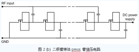無源RFID 標(biāo)簽芯片工作時(shí)所需要的能量完全來源于讀卡器產(chǎn)生的電磁波的能量,因此,電源恢復(fù)電路需要將標(biāo)簽天線感應(yīng)出的超高頻信號(hào)轉(zhuǎn)換為芯片工作需要的直流電壓,為芯片提供能量。本文第2 部分將介紹電源恢復(fù)電路的設(shè)計(jì)。由于RFID 標(biāo)簽所處的電磁環(huán)境是十分復(fù)雜的,輸入信號(hào)的功率可以變化幾百甚至幾千倍,因此,為了芯片在大小不同的場(chǎng)強(qiáng)中均可以正常工作,必須設(shè)計(jì)可靠的電源穩(wěn)壓電路。本文第3部分將對(duì)電源穩(wěn)壓電路的設(shè)計(jì)進(jìn)行說明。調(diào)制與解調(diào)電路是標(biāo)簽與讀卡器進(jìn)行通信的關(guān)鍵電路,目前絕大部分的UHF RFID 標(biāo)簽采用的是ASK調(diào)制,本文在第4 部分對(duì)調(diào)制與解調(diào)進(jìn)行介紹。RFID 標(biāo)簽的控制單元是處理指令的數(shù)字電路。為使標(biāo)簽在進(jìn)入讀卡器場(chǎng)區(qū)后,數(shù)字電路可以正確復(fù)位,以響應(yīng)讀卡器的指令,必須設(shè)計(jì)可靠的啟動(dòng)信號(hào)產(chǎn)生電路,用來提供數(shù)字單元的復(fù)位信號(hào)。本文在第5 部分將討論啟動(dòng)信號(hào)產(chǎn)生電路的設(shè)計(jì)。