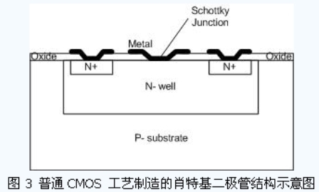 在一般的無源UHF RFID 標(biāo)簽的應(yīng)用中,出于成本的考慮,希望芯片電路適合于普通CMOS工藝的制造。而遠(yuǎn)距離讀寫的要求對(duì)電源恢復(fù)電路的功率轉(zhuǎn)換效率提出了較高的要求。為此,很多設(shè)計(jì)者采用標(biāo)準(zhǔn)CMOS 工藝來實(shí)現(xiàn)肖特基勢(shì)壘二極管,從而可以方便地采用多級(jí)Dickson倍壓電路結(jié)構(gòu)來提高電源轉(zhuǎn)換的性能。圖3 所示是普通CMOS 工藝制造的肖特基二極管結(jié)構(gòu)示意圖。在設(shè)計(jì)中,不需要更改工藝步驟和掩膜板生成規(guī)則,只需在版圖上作一些修改,就可以制作出肖特基二極管。