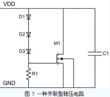 在RFID 標(biāo)簽芯片中,需要有一個(gè)較大電容值的儲(chǔ)能電容存儲(chǔ)足夠的電荷以供標(biāo)簽在接收調(diào)制信號(hào)時(shí),仍可在輸入能量較小的時(shí)刻(例如OOK調(diào)制中無載波發(fā)出的時(shí)刻),維持芯片的電源電壓。如果輸入能量過高,電源電壓升高到一定程度,穩(wěn)壓電路中電壓感應(yīng)器將控制泄流源將儲(chǔ)能電容上的多余電荷釋放掉,以此達(dá)到穩(wěn)壓的目的。圖7 是其中一種并聯(lián)型穩(wěn)壓電路。三個(gè)串聯(lián)的二極管D1、D2、D3 與電阻R1 組成電壓感應(yīng)器,控制泄流管M1 的柵極電壓。當(dāng)電源電壓超過三個(gè)二極管開啟電壓之和后,M1 柵極電壓升高,M1 導(dǎo)通,開始對(duì)儲(chǔ)能電容C1 放電。