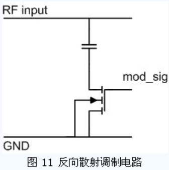 無源UHF RFID 標(biāo)簽一般采用反向散射的調(diào)制方法,即通過改變芯片輸入阻抗來改變芯片與天線間的反射系數(shù),從而達(dá)到調(diào)制的目的。一般設(shè)計(jì)天線阻抗與芯片輸入阻抗使其在未調(diào)制時(shí)接近功率匹配,而在調(diào)制時(shí),使其反射系數(shù)增加。常用的反向散射方法是在天線的兩個(gè)輸入端間并聯(lián)一個(gè)接有開關(guān)的電容,如圖11 所示,調(diào)制信號(hào)通過控制開關(guān)的開啟,決定了電容是否接入芯片輸入端,從而改變了芯片的輸入阻抗。