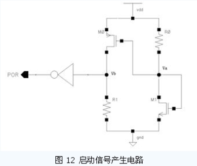 該電路仍然存在的靜態(tài)功耗的問題,可以通過增大電阻值,合理選擇MOS 管尺寸來降低靜態(tài)功耗的影響。要想完全解決靜態(tài)功耗的問題則需要設(shè)計(jì)額外的反饋控制電路,在啟動(dòng)信號(hào)產(chǎn)生后關(guān)斷這部分電路。但是,需要特別注意引入反饋后產(chǎn)生的不穩(wěn)定態(tài)的問題。