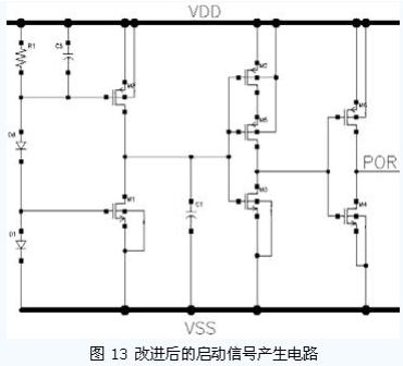 通常,無源RFID 標(biāo)簽進(jìn)入場(chǎng)區(qū)后,電源電壓上升的時(shí)間并不確定,有可能很長(zhǎng)。這就要求設(shè)計(jì)的啟動(dòng)信號(hào)產(chǎn)生電路產(chǎn)生啟動(dòng)信號(hào)的時(shí)刻與電源電壓相關(guān)。圖12 所示是一種常見的啟動(dòng)信號(hào)產(chǎn)生電路。