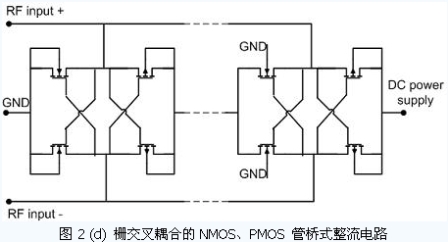 在這些電源恢復(fù)電路中,并不存在最理想的電路結(jié)構(gòu),每種電路都有各自的優(yōu)點(diǎn)及缺陷。在不同的負(fù)載情況、不同的輸入電壓情況、不同的輸出電壓要求以及可用的工藝條件下,需要選擇不同的電路以使其達(dá)到最優(yōu)的性能。圖2(a)所示的多級(jí)二極管倍壓電路,一般采用肖特基勢(shì)壘二極管。它具有倍壓效率高、輸入信號(hào)幅度小的優(yōu)點(diǎn),應(yīng)用十分廣泛。但是,一般代工廠的普通CMOS 工藝不提供肖特基勢(shì)壘二極管,在工藝的選擇上會(huì)給設(shè)計(jì)者帶來麻煩。圖2(b)是用接成二極管形式的PMOS 管來代替肖特基二極管,避免了工藝上的特殊要求。這種結(jié)構(gòu)的倍壓電路需要有較高的輸入信號(hào)幅度,在輸出電壓較高時(shí)具有較好倍壓效率。圖2(c)是傳統(tǒng)的二極管全波整流電路。與Dickson 倍壓電路相比,倍壓效果更好,但引入了更多的二極管元件,功率轉(zhuǎn)換效率一般略低于Dickson 倍壓電路。另外,由于它的天線輸入端與芯片地分離,從天線輸入端向芯片看去,是一個(gè)電容隔直的全對(duì)稱結(jié)構(gòu),避免了芯片地與天線的相互影響,適合于與對(duì)稱天線(例如偶極子天線)相接。圖2(d)是許多文獻(xiàn)提出的全波整流電路的CMOS 管解決方案。在工藝受限的情況下,可以獲得較好的功率轉(zhuǎn)換效率,并且對(duì)輸入信號(hào)幅度的要求也相對(duì)較低。