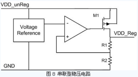 另外一類穩(wěn)壓電路的原理則是采用串聯(lián)式的穩(wěn)壓方案。它的原理圖如圖8 所示。參考電壓源是被設(shè)計(jì)成一個(gè)與電源電壓無關(guān)的參考源。輸出電源電壓經(jīng)電阻分壓后與參考電壓相比較,通過運(yùn)算放大器放大其差值來控制M1 管的柵極電位,使得輸出電壓與參考源基本保持相同的穩(wěn)定狀態(tài)。