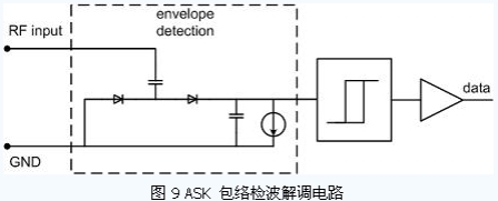 出于減小芯片面積和功耗的考慮,目前大部分無源RFID 標(biāo)簽均采用了ASK 調(diào)制。對(duì)于標(biāo)簽芯片的ASK 解調(diào)電路,常用的解調(diào)方式是包絡(luò)檢波的方式,如圖9 所示。
