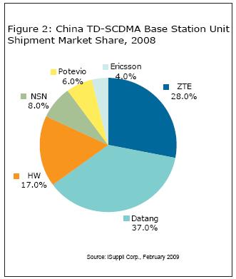 大唐以每載波頻率不到4000美元的最低價獲得了中國移動TD-SCDMA合同的最大份額。大唐目前在該合同中的市場份額達37%,中興和華為分別以28%與17%居其后。