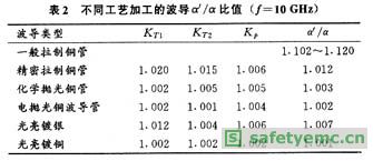 由Benson和AILison對各種不同工藝加工的口徑為25.4mm×12.7mm銅波導(dǎo)管,測出KT1,KT2,Kp之后,據(jù)上式算出的α′/α之值見表2[1]。[page]