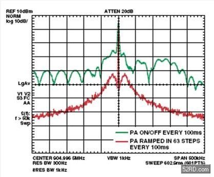 圖四加強說明了頻譜飛散的問題,其中黃色的軌跡線表示當PA以每次100ms的速度開關,而頻譜分析儀維持在最大保持(maximumhold)設定時,ADF7020發射器的PA輸出頻譜。可以很清楚的看出來,有明顯的功率會落入載波(carrier)兩邊的頻道中。藍色的軌跡線則是以每100ms64階的速率被提升與拉下的PA輸出,表示出落入臨近頻道的功率有相當程度的下降。最新的EN300220法令中的規格8.5,便針對落入臨近頻道功率制定限制值。