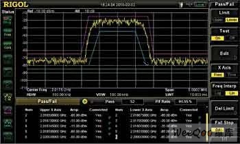 對于問題三可以利用DSA1030A頻譜分析儀中的Pass/Fail功能來解決。用戶根據實際的需求提前編輯好兩條標準跡線即測量的上限和下限,開啟該功能后會對測量結果進行統(tǒng)計通過率。在測量失敗的時候會自動停止測量,查看測量失敗的頻率和幅度。如圖3所示,利用Pass/Fail功能監(jiān)控信號的大小。