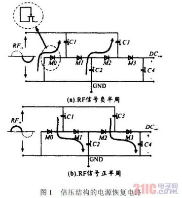 倍壓結(jié)構(gòu)的電源恢復(fù)電路如圖1所示。圖中的二極管在實際應(yīng)用時通常用MOS管替代。輸入正弦交流信號RFin=VAsint。在RFin負(fù)半周期時,M0導(dǎo)通,C1充電。C1兩端能夠獲得的最大電壓為VA-Vd,其中,Vd為MOS管M0兩端的電壓降。