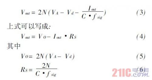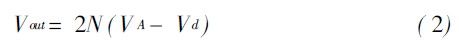 RFin正半周期時,節(jié)點1的最大電壓為VA+(VA-Vd)。該電壓使得M1導(dǎo)通,C2充電,直到C2兩端達到最大電壓,即節(jié)點2的最大電壓,為VA+(VA- Vd)-Vd=2(VA-Vd)。依次類推,C3兩端能夠獲得的最大電壓為3(VA-Vd),節(jié)點4的最大電壓為4(VA-Vd)。節(jié)點2N的最大電壓為 2N(VA-Vd)。于是,對于2N級電路,輸出直流電壓為: