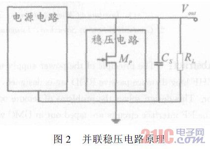 通常的并聯(lián)式穩(wěn)壓結(jié)構(gòu)如圖2所示。當(dāng)Vout大于穩(wěn)壓電路開啟閾值時,穩(wěn)壓電路內(nèi)的瀉流管Mp開啟,從瀉流管瀉放電流,使電壓降低。