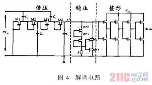 解調(diào)電路如圖4所示。M1~M4 為4級倍壓單元,起到檢波二極管的作用。由于并聯(lián)穩(wěn)壓電路的瀉流管無法瞬間關(guān)斷,因此,在OOK信號關(guān)斷時刻,瀉流管抽取電容C4上的電荷。電容C4取值較小,因此,p1點電平迅速下降,形成較大的下脈沖凹陷,經(jīng)過后級的整形電路,輸出標(biāo)準(zhǔn)的解調(diào)波形。