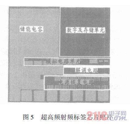 該射頻前端模塊作為超高頻長距離無源射頻標(biāo)簽芯片的一部分,在UMC0.18m混合信號工藝下設(shè)計實現(xiàn),并流片驗證。芯片照片如圖5所示。