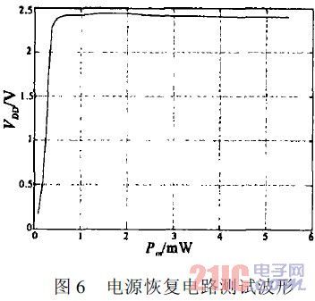 根據(jù)芯片測試結(jié)果,該射頻接口電路能夠在讀寫器4W等效發(fā)射功率下距讀寫器4m處為射頻標(biāo)簽芯片提供足夠的工作電壓,并且在芯片近場時能夠有效地穩(wěn)定電源電壓。解調(diào)信號基本正常可用。因此,該射頻接口電路可滿足超高頻遠(yuǎn)距離無源射頻標(biāo)簽芯片的要求,具有實用意義。