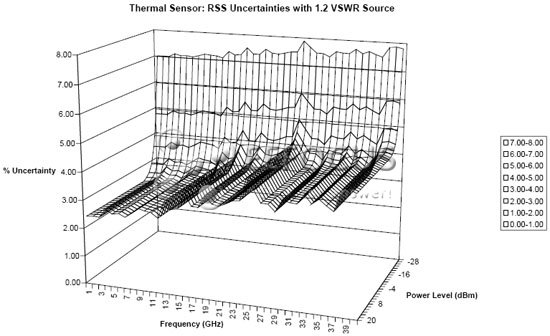 該圖顯示了熱電堆傳感器在其整個工作頻率范圍內的不確定性表面。在該情形下,信號源匹配一直固定在1.2,所以由于不匹配引起的不確定性被減小了。不確定性已經被當作RSS項疊加。在低功率電平上不確定性的增加主要是由零位調整參數引起的。這種與頻率相關的紋波是因在整個范圍內變化的校正因子的不確定性引起的。